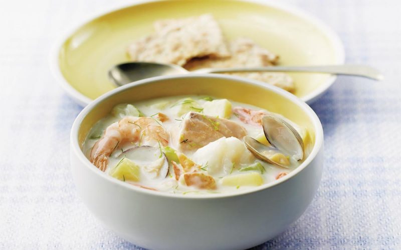 - 2 cups (500 mL) chopped raw skinless fish fillets or cooked seafood (shrimp, lobster, scallops, crab, clams, oysters) or a combination