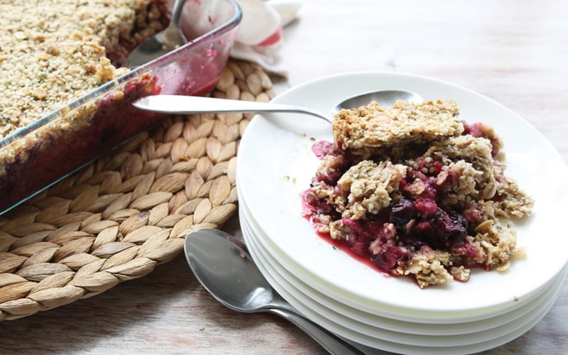 3. In a separate bowl, whisk coconut oil and maple syrup together. Add in oats, hemp hearts, granola, almond flour, cinnamon and salt and mix until well combined. Pour granola and oat mixture on top of the berries and spread out evenly.