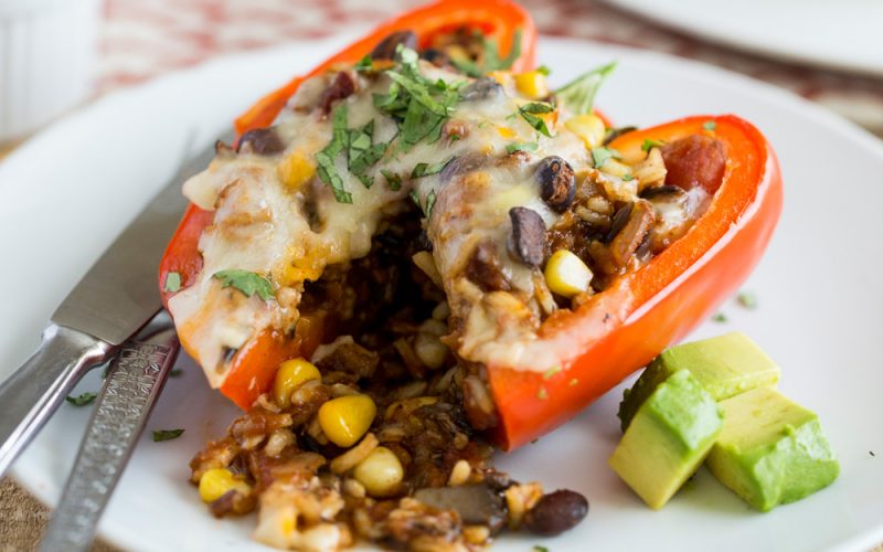 - Spoon rice mixture into each pepper half; approximately ½ cup (125 mL) in each. Sprinkle each pepper with shredded cheese. Cover baking dish with foil and bake for 25 to 30 minutes, or until peppers are softened.
