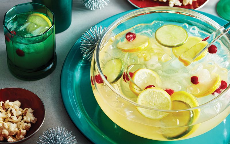 Give your guests this sweet honey and zesty ginger holiday punch as soon as they enter the party. It’s a warming and fragrant holiday season sipper, made refreshing with thirst-quenching lemonade, ice-cold citrus slices and an effervescent hit of de-alcoholized wine, which can be substituted with sparkling wine if you prefer an adults-only version.