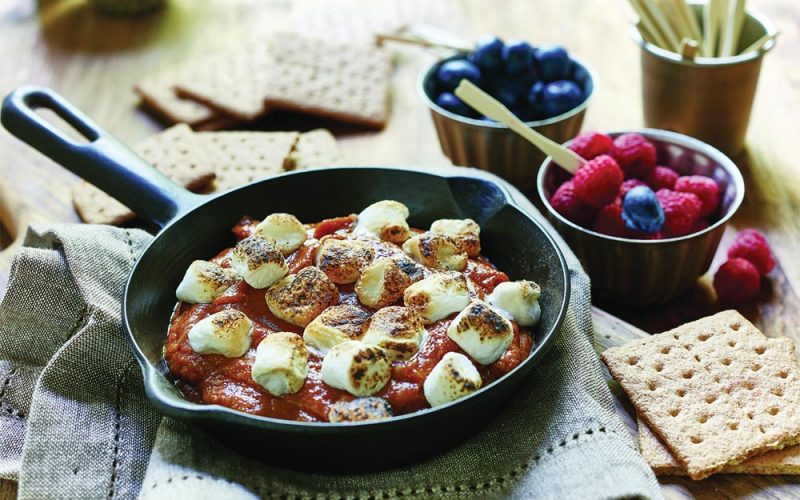 - Combine all ingredients in a 10” (25 cm) cast iron pan. Heat over medium-high heat, stirring until thickened, about 10 minutes. Top with marshmallows. Serve with fruit dippers and graham crackers.