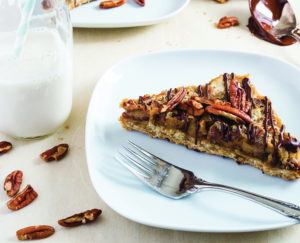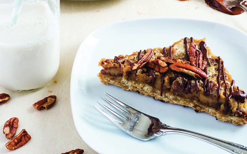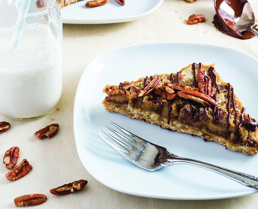 - Sprinkle chopped pecans evenly over base, then pour filling over top. Bake for 30 minutes or until set in the middle and lightly browned. Cool to room temperature.
