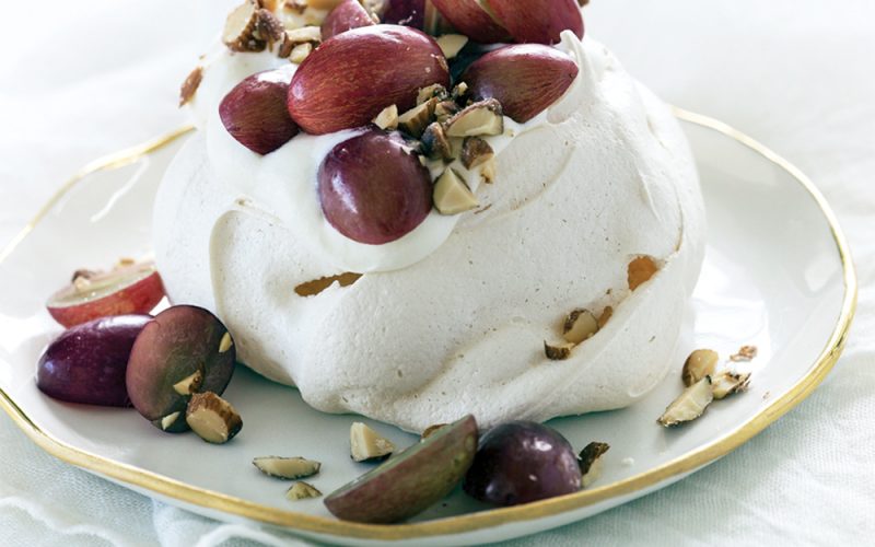 This delicious recipe is an inspired variation where grapes add a pop of colour to the bright white meringue backdrop of a pavlova. Red grapes are particularly beautiful here, and their flavourful juiciness contrasts with the pure sweetness of the meringue. Sweet-tart lemon curd cream brings in additional flavour dimensions and colour.